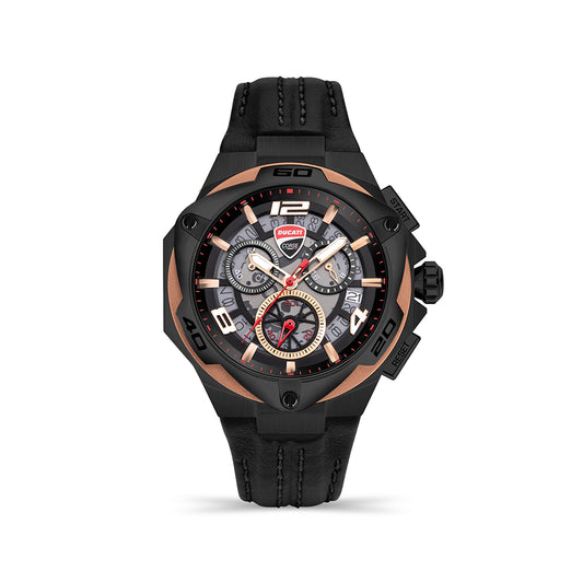 السعي وراء التميز هو الفلسفة التي تقود ثقافة دوكاتي، مما أدى إلى مصيرها لتصبح العلامة التجارية الأكثر شهرة للدراجات النارية. دوكاتي مرادف للنجاح، والأناقة الإيطالية، والهيبة والعاطفة. دوكاتي كورس - قسم سباقات دوكاتي - يطور الدراجات التي تشارك في مسابقات MotoGP وSuperbike لإطلاق خط الساعات. تمنح دوكاتي كورس الحياة لمجموعة تجسد خصائص العلامة التجارية: الروح الرياضية، وتكنولوجيا الدرجة الأولى والشغف بالتصميم الحصري.